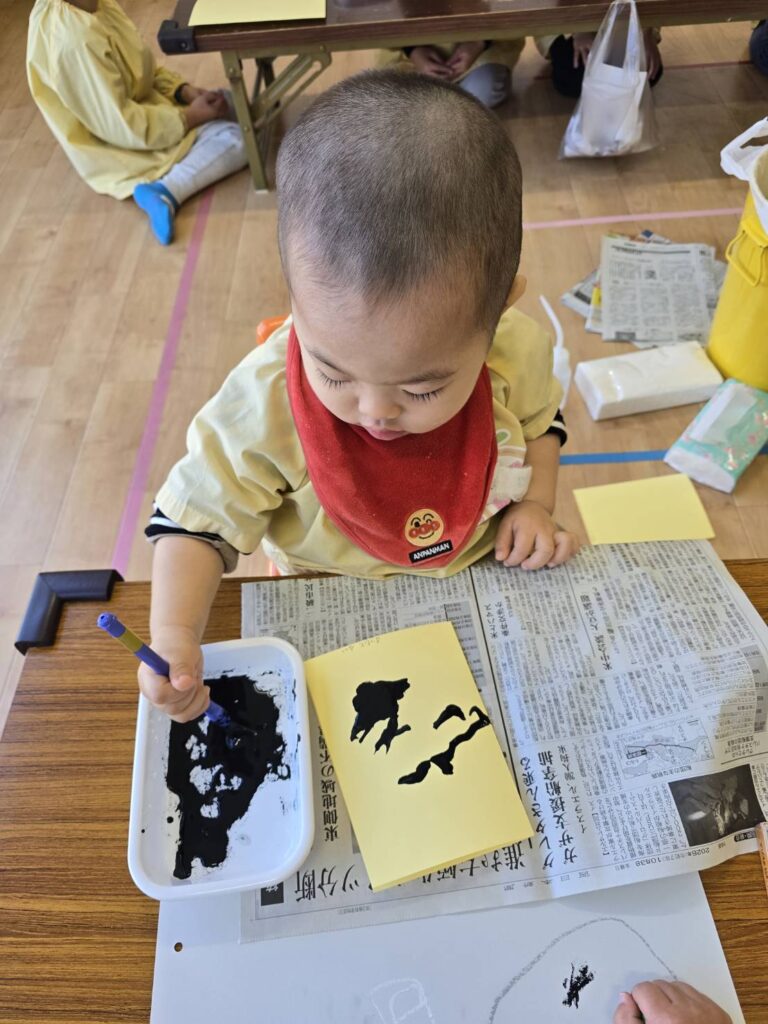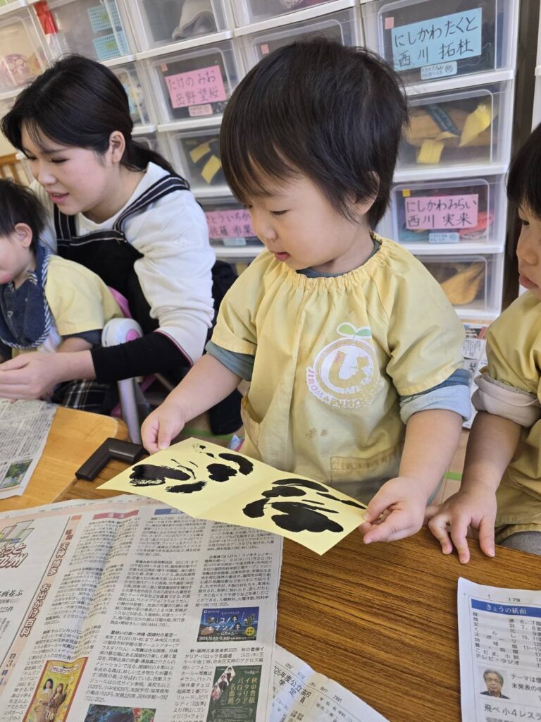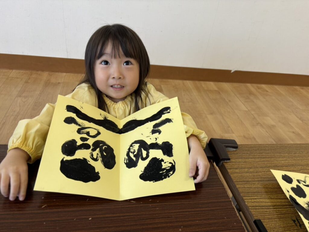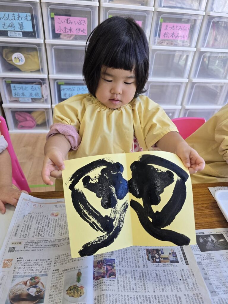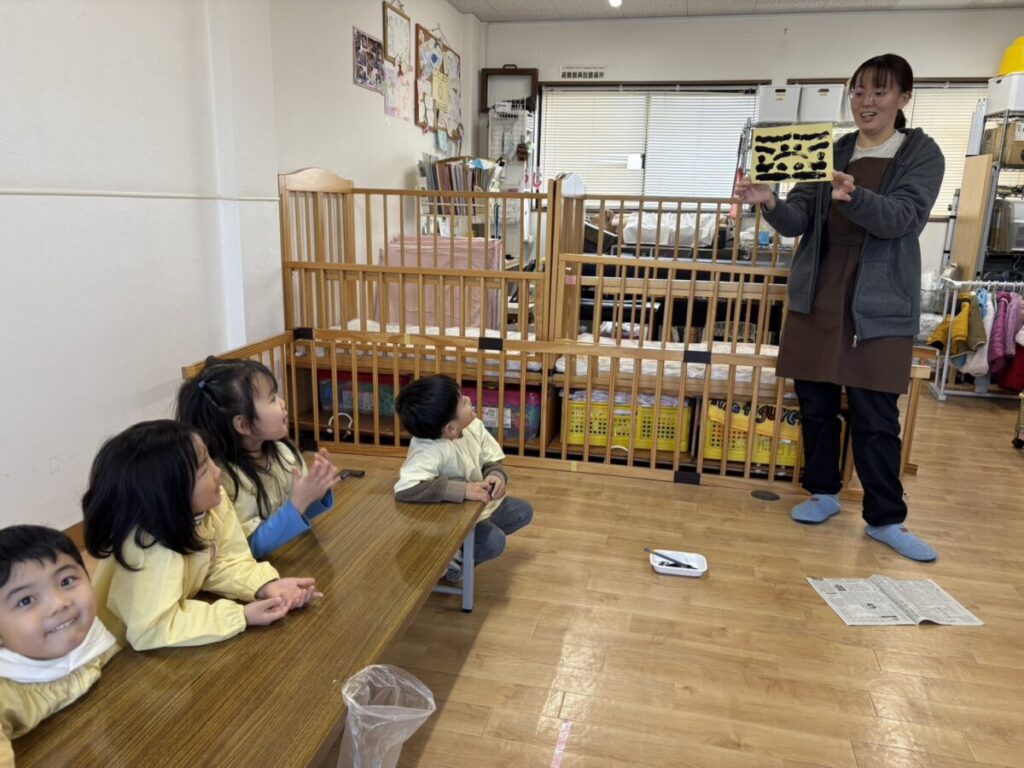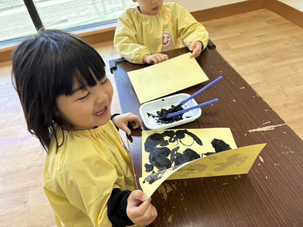 2026年02月02日 節分の制作★ 2月 じろうまる園のブログ まるじメソッド 異年齢保育 節分 節分の制作に、鬼のパンツを作りました(*^^*) デカルコマニーという転写の技法を用いて 黒の絵の具だけで行いました。 先生からどんなことをするのか お話です。 みんなしっかりと耳を傾けていました(*^^*) 小さい子も大きい子も、 どんな模様になるかワクワクドキドキでした(*^^*) 個性あふれるパンツが勢ぞろいしました(*^^*) 楽しい政策となりました(*^^*) 前の記事 次の記事 関連記事 2026年04月02日 令和8年度スタート!! 4月 じろうまる園のブログ まるじメソッド 異年齢保育 2026年04月01日 令和8年3月31日 令和7年度最後の日 3月 じろうまる園のブログ 異年齢保育 2026年03月29日 お別れ会 3月 お別れ遠足 じろうまる園のブログ 異年齢保育 野遊び保育 2026年03月23日 遊ぶぞ~~~!!!(≧◇≦)/~~~ 3月 じろうまる園のブログ まるじメソッド 公園 異年齢保育 野遊び保育 2026年03月21日 卒園式で歌う歌 3月 じろうまる園のブログ すだちの会 まるじメソッド 異年齢保育 2026年03月20日 卒園式会場作り 3月 じろうまる園のブログ すだちの会 まるじメソッド 異年齢保育