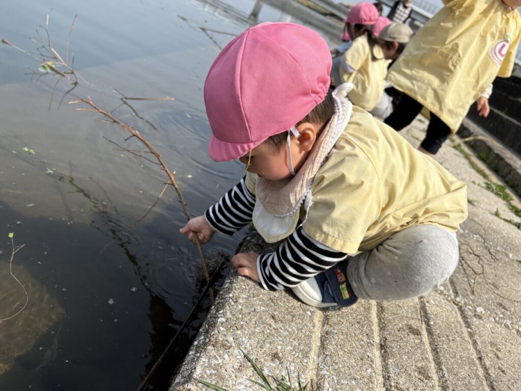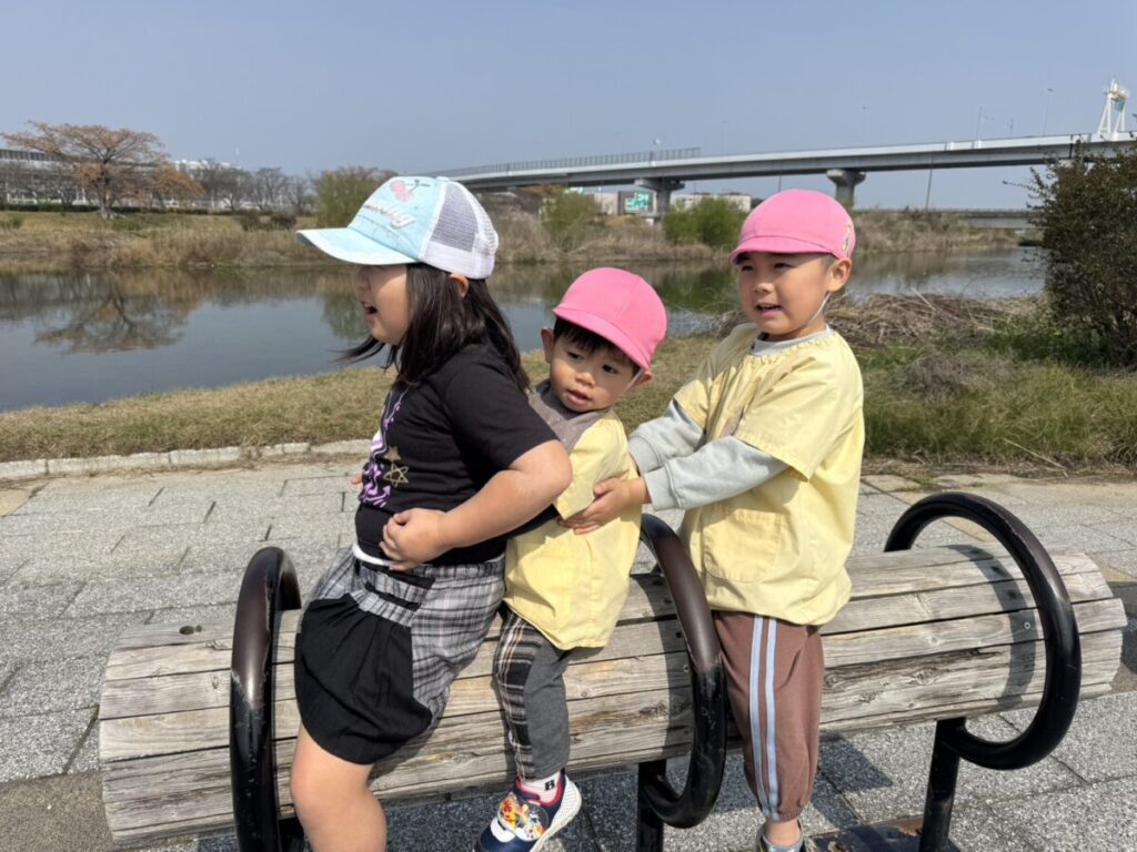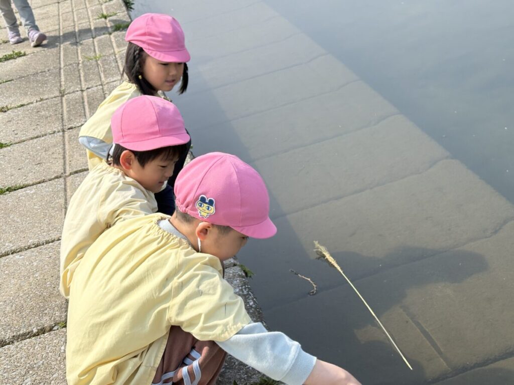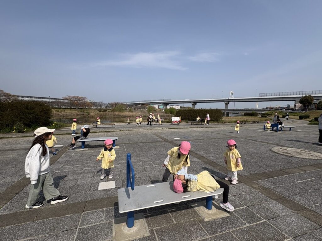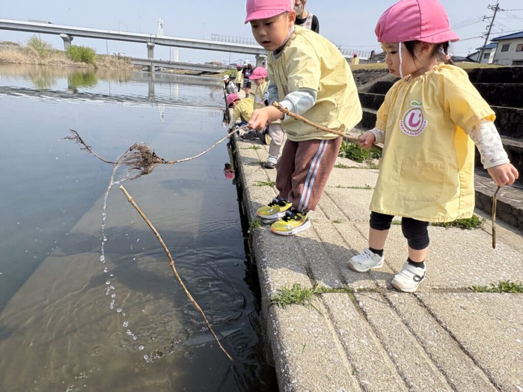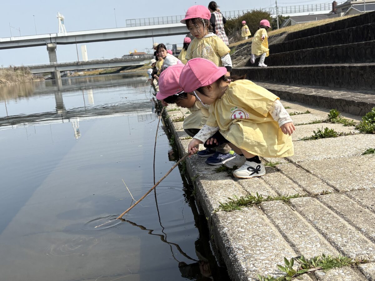 テントが立ち、小さい子たちがお部屋から降りてきて、室見川へ出発です!