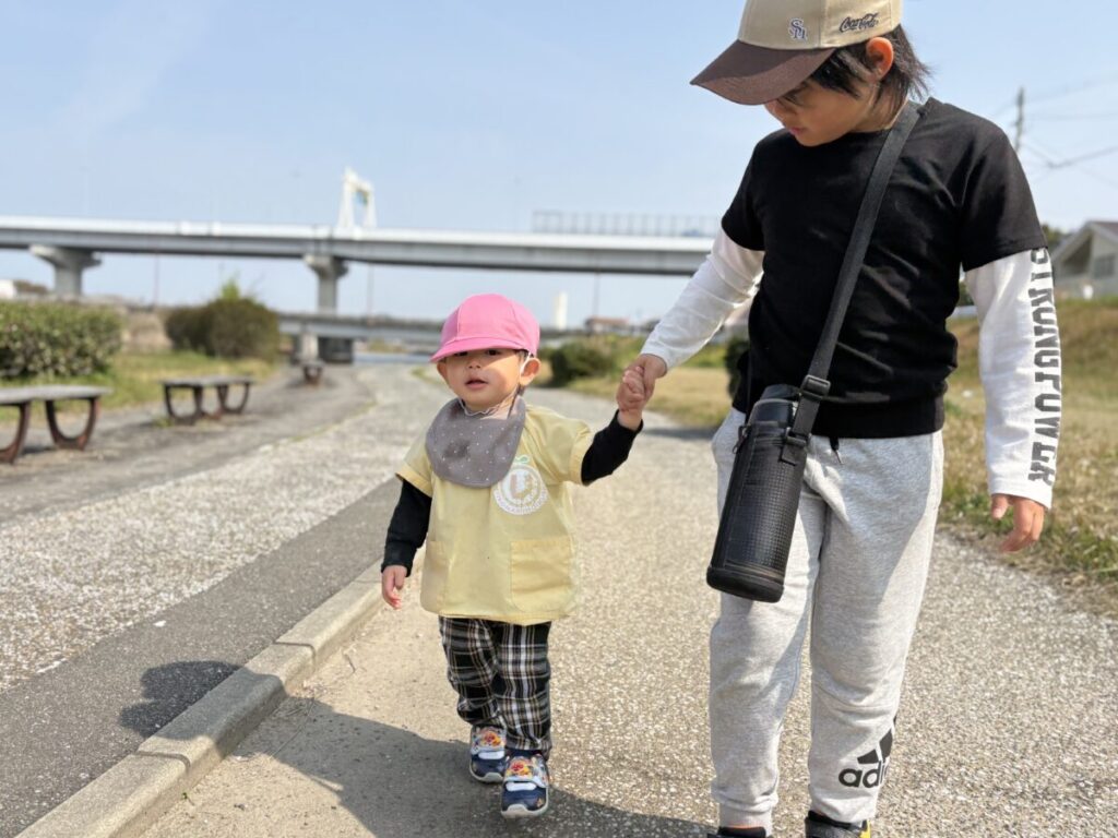 お兄ちゃんと手を繋いで上手に歩けました!